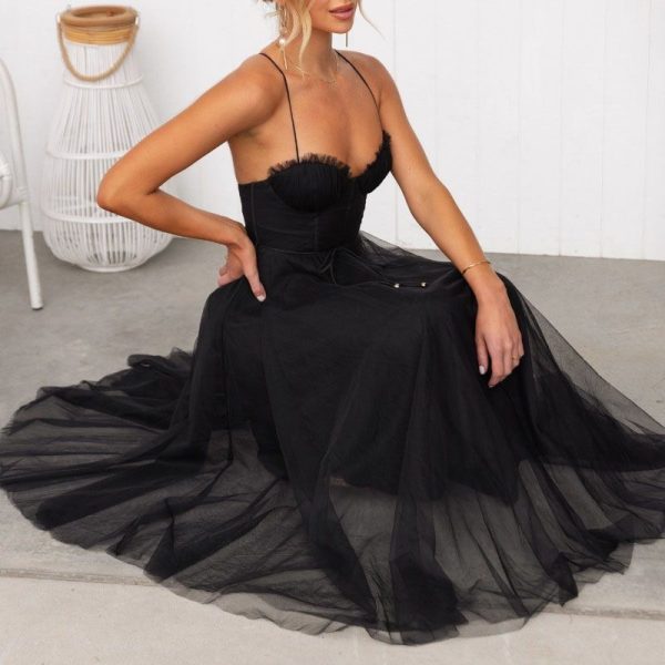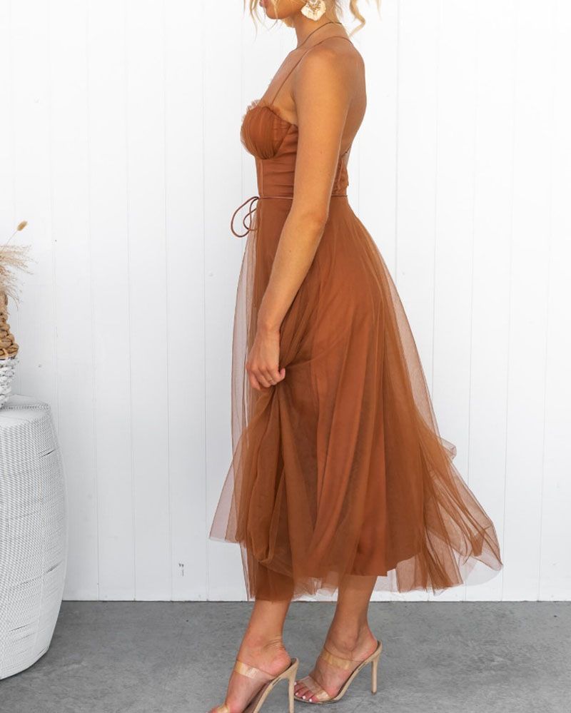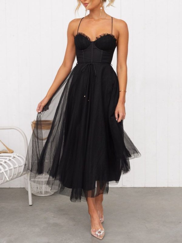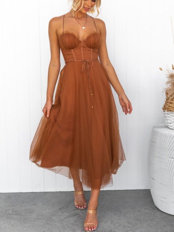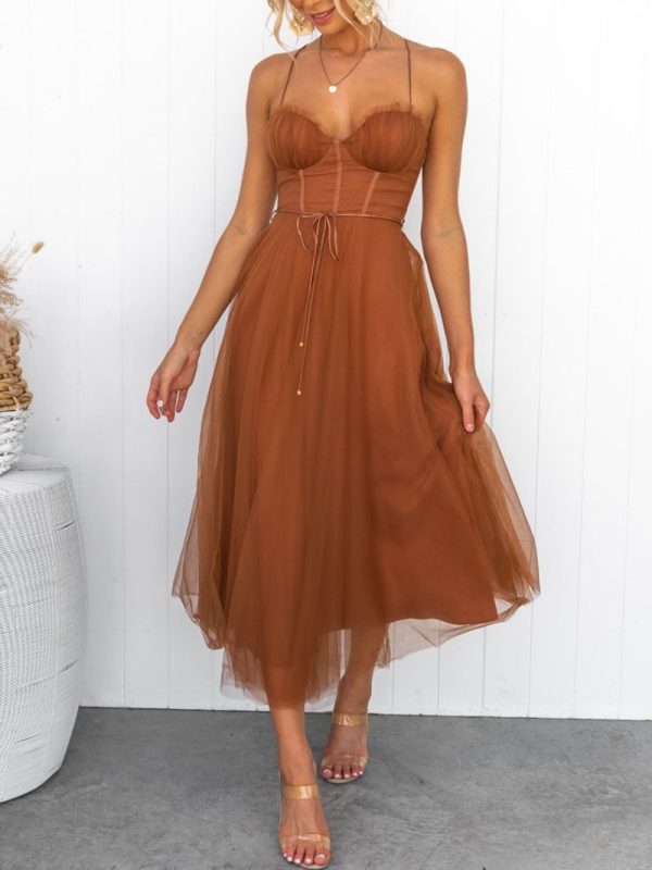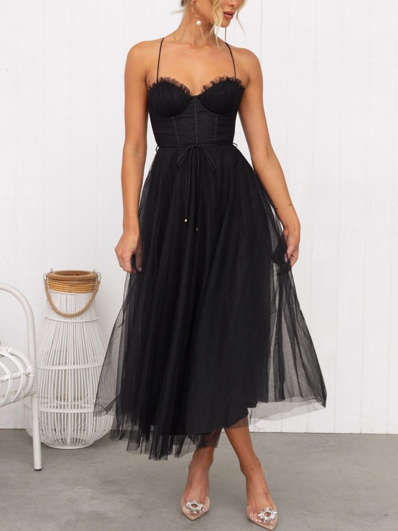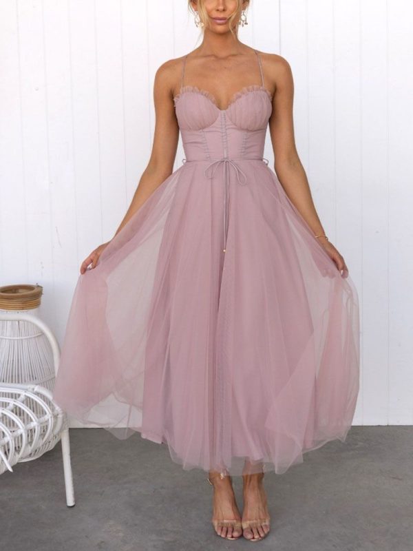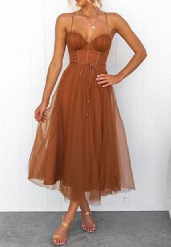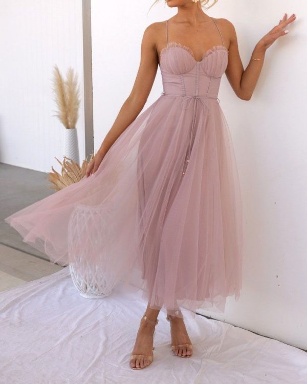 Tie Waist Criss Back Tea Length Bustier Tulle Formal Cocktail Dress