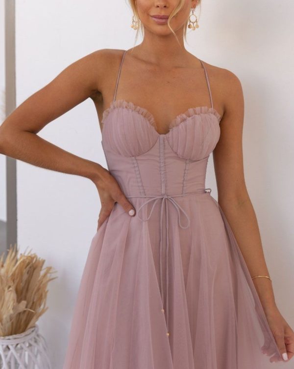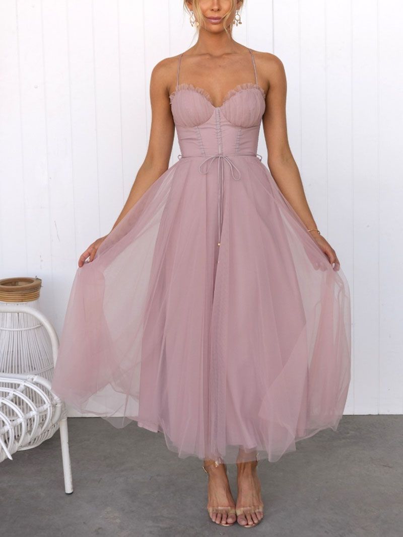 / Tie Waist Criss Back Tea Length Bustier Tulle Formal Cocktail Dress